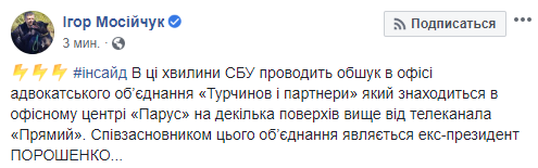 "В эти минуты СБУ проводит обыск в офисе адвокатского объединения "Турчинов и партнеры", который находится в офисном центре "Парус" на несколько этажей выше телеканала "Прямой". Соучредителем этого объединения является экс-президент Порошенко ..." - говорится в сообщении.
