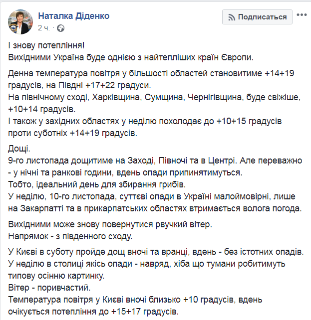 На вторых выходных ноября в Украине установится практически летняя температура около +20 и даже выше. Такой приятный прогноз дает в своем Facebook синоптик Наталья Диденко.