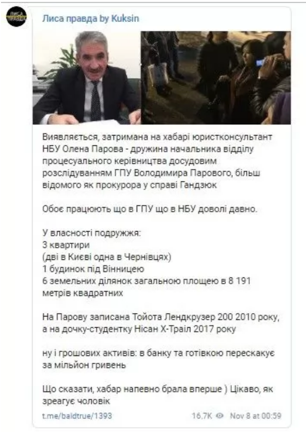 Паровой известен тем, что занимается делом об убийстве херсонской активистки Екатерины Гандзюк. По словам авторов поста в Telegram, и Паровой в ГПУ, и его супруга в НБУ работают довольно давно.