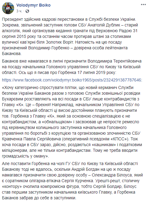 По словам Бойко, Баканов еще летом пытался поставить Горбенко на киевский главк СБУ, но в ходе аппаратных войн с Андреем Богданом это место досталось компромиссной фигуре – Сергею Болдырю.