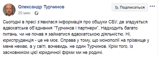 "Сегодня в прессе появилась информация об обысках СБУ, где упоминается адвокатское объединение "Турчинов и партнеры". Поступает много вопросов, не стал ли я заниматься адвокатской деятельностью. Нет, юриспруденция - это не мое. Дело в том, что монополии на фамилию у меня нет, а в мире, очевидно, не один Турчинов. Кроме того, с основателем этой юридической фирмы мы не родственники", - написал политик.