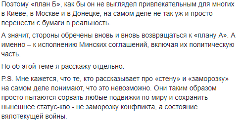 P.S. Мне кажется, что те, кто рассказывает про «стену» и «заморозку» на самом деле понимают, что это невозможно. Они таким образом просто пытаются сорвать любые подвижки по миру и сохранить нынешнее статус-кво - не заморозку конфликта, а состояние вялотекущей войны".