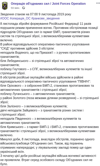 За прошедшие сутки, 8 ноября, в результате обстрелов, ранен один военнослужащий Объединенных сил. Также, от ранений полученных накануне, в больнице скончался еще один украинский военный.