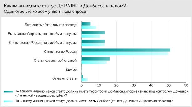 Лишь 0,8% респондентов отказались или затруднились ответить на вопрос по поводу статуса территорий, находящихся сейчас под контролем "ЛНР/ДНР", пишет издание.