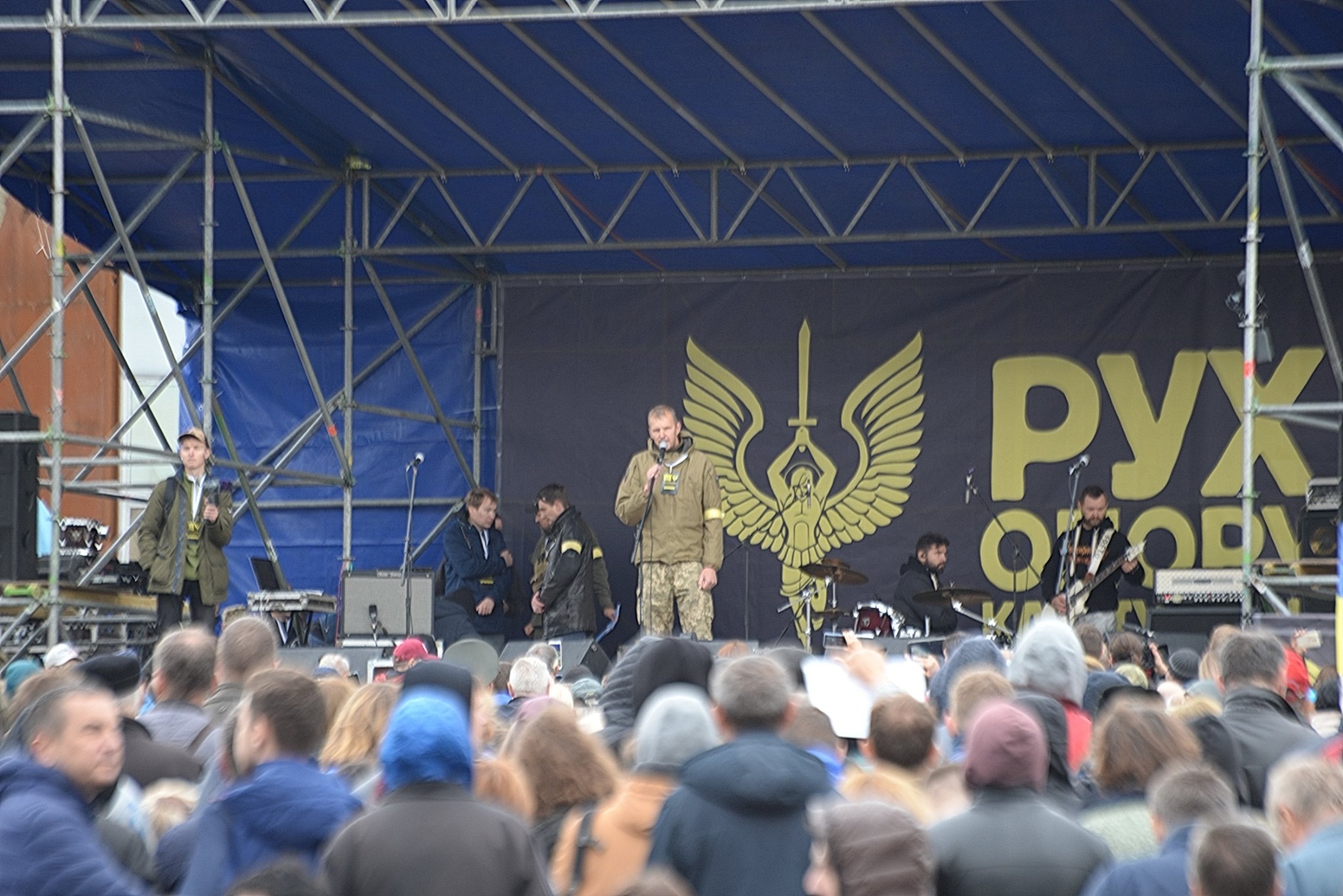 На Facebook Мазура есть фото, как он выступает на сцене Майдана во время акций "Руха" против капитуляции и Зеленского.