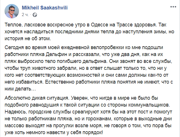 Бывший президент Грузии и губернатор Одесской области Михаил Саакашвили во время велопрогулки по Одессе увидел мертвого дельфина, которого коммунальщики несколько дней не убирают с пляжа. Свои чувства по этому поводу политик излил в соцсети Facebook.