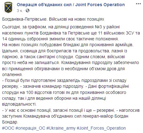 Утверждается, что на новых позиция уже построены блиндажи для проживания бойцов ВСУ, а также столовая, баня, хранилища для боеприпасов. Они также были обеспечены обогревателями и дровами для отопления.