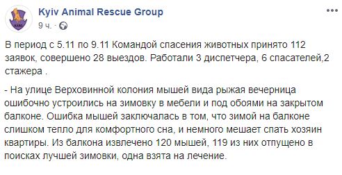 "На улице Верховинной колония мышей вида рыжая вечерница ошибочно устроились на зимовку в мебели и под обоями на закрытом балконе. Ошибка мышей заключалась в том, что зимой на балконе слишком тепло для комфортного сна, и немного мешает спать хозяин квартиры", – сообщает Команда.
