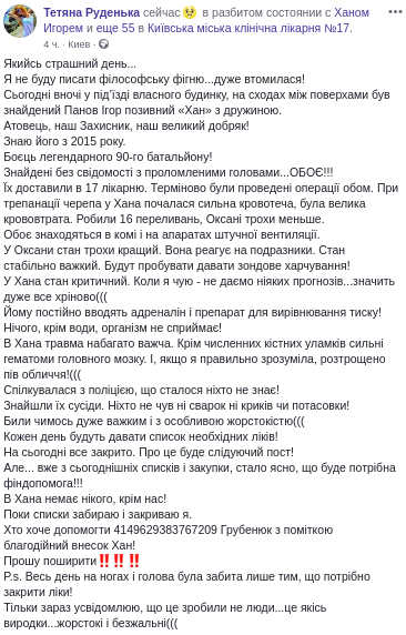 "Сегодня ночью в подъезде собственного дома, на лестнице между этажами был найден Панов Игорь, позывной "Хан" с женой... боец легендарного 90-го батальона. Найдены без сознания с проломленными головами", - рассказала волонтер.