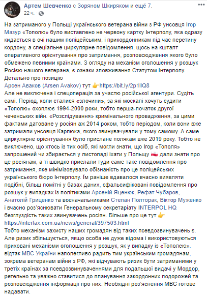 Польская сторона была заранее уведомлена о поездке ветерана АТО Игоря Мазура (позывной Тополь) в Польшу, поскольку ориентировка на него была получено польским бюро Интерпола от российских коллег незадолго до его задержания на пограничном пункте Дорогуск. Об этом на своей странице в соцсети написал глава департамента коммуникаций Министерства внутренних дел Украины Артем Шевченко.