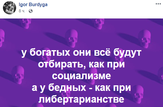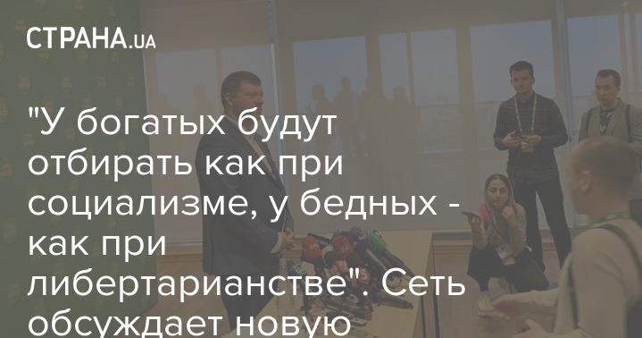 "У богатых они всё будут отбирать, как при социализме. У у бедных - как при либертарианстве", - шутит журналист Игорь Бурдыга, напоминая, что ранее в "Слуге народа" заявляли, что их идеология - либертарианство, которое заключается в полной экономической свободе и минимальном влиянии государства.