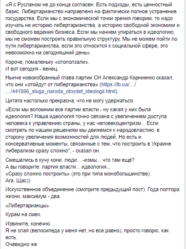 "...Нынче новоизбранный глава партии СН Александр Корниенко сказал, что они "отойдут от либертарианства". Цитата настолько прекрасна, что не могу удержаться.
