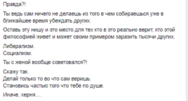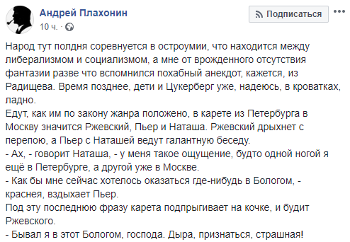 "Народ тут полдня соревнуется в остроумии, что находится между либерализмом и социализмом, а мне от врожденного отсутствия фантазии разве что вспомнился похабный анекдот, кажется, из Радищева. Время позднее, дети и Цукерберг уже, надеюсь, в кроватках, ладно.