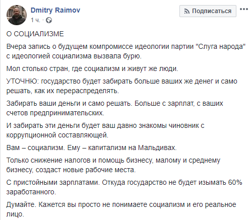 Экс-советник главы Минздрава и пиарщик Дмитрий Раимов написал, что социализм, который предлагают в Украине, на самом деле означает, что государство будет забирать больше денег у граждан и само решать, как их перераспределять, вместо того, чтобы снизить налоги и помочь малому и среднему бизнесу создать новые рабочие места.