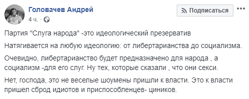 "Партия "Слуга народа" -это идеологический презерватив. Натягивается на любую идеологию: от либертарианства до социализма. Очевидно, либертарианство будет предназначено для народа , а социализм - для его слуг. Ну тех, которые сказали, что они секси.