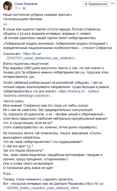 Шеф-редактор LB.ua Соня Кошкина напомнила, как после выборов идеолог партии "Слуга народа" Руслан Стефанчук заявил о либертарианстве, но затем партия начала понемногу "отползать", поскольку, возможно, Стефанчук вообще сказал это "от себя".