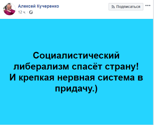 Нардеп Алексей Кучеренко написал, что "социалистический либерализм спасет страну. И крепкая нервная система в придачу".