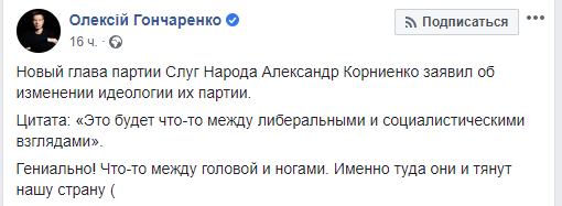 "Новый глава партии Слуг Народа Александр Корниенко заявил об изменении идеологии их партии. Цитата: "Это будет что-то между либеральными и социалистическими взглядами". Гениально! Что-то между головой и ногами. Именно туда они и тянут нашу страну"