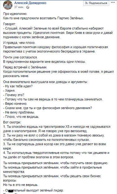 Экс-депутат Киевсовета, бизнесмен Алексей Давиденко в связи с идеологией вспомнил, как ему предлагали возглавить Партию Зеленых.