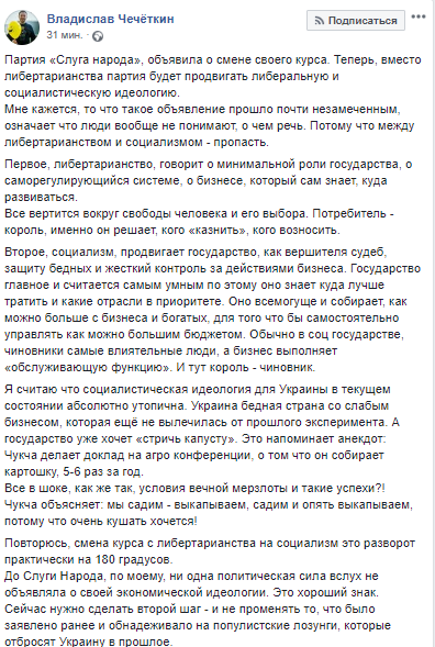 "Вчера запись о будущем компромиссе идеологии партии "Слуга народа" с идеологией социализма вызвала бурю. Мол столько стран, где социализм и живут же люди.