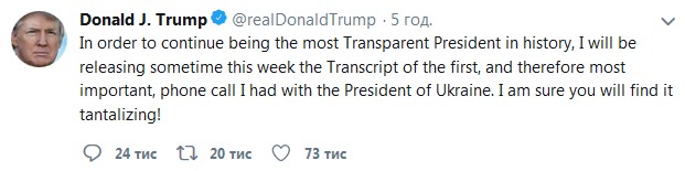 "Чтобы и дальше оставаться самым открытым президентом в истории, я опубликую где-то на этой неделе стенограмму первого и, следовательно, самого важного телефонного разговора с президентом Украины. Я уверен, что вы найдете его привлекательным", - написал Трамп в своем Twitter.