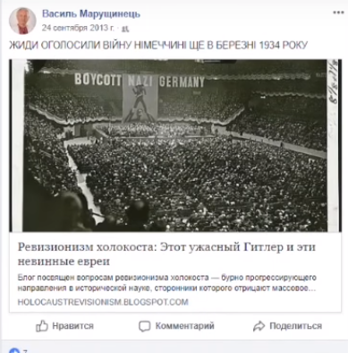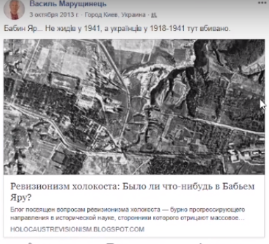 Среди прочих записей Марущинца можно было увидеть такие антисемитские посты: "Ж@ды огласили войну Германии в 1934 году", "Боже, накажи ж@дов", "Бабий Яр. Не ж@дов в 1941 году, а украинцев 1918-1941 тут убито", "Ж@ды – говно".