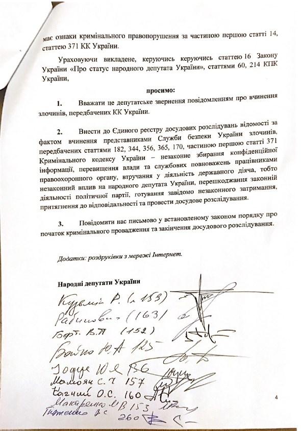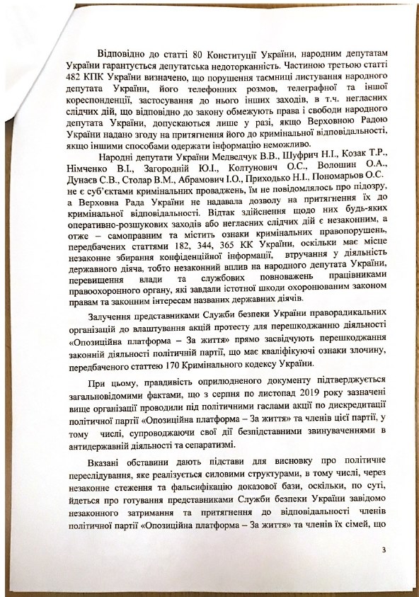 Депутаты "Оппозиционной платформы - За жизнь" написали коллективное заявление в Госбюро расследований о привлечении к уголовной ответственности руководства СБУ за незаконное вмешательство в деятельность нардепов. Соответствующий документ нардеп от этой политсилы Ренат Кузьмин опубликовал на своей странице в Facebook.