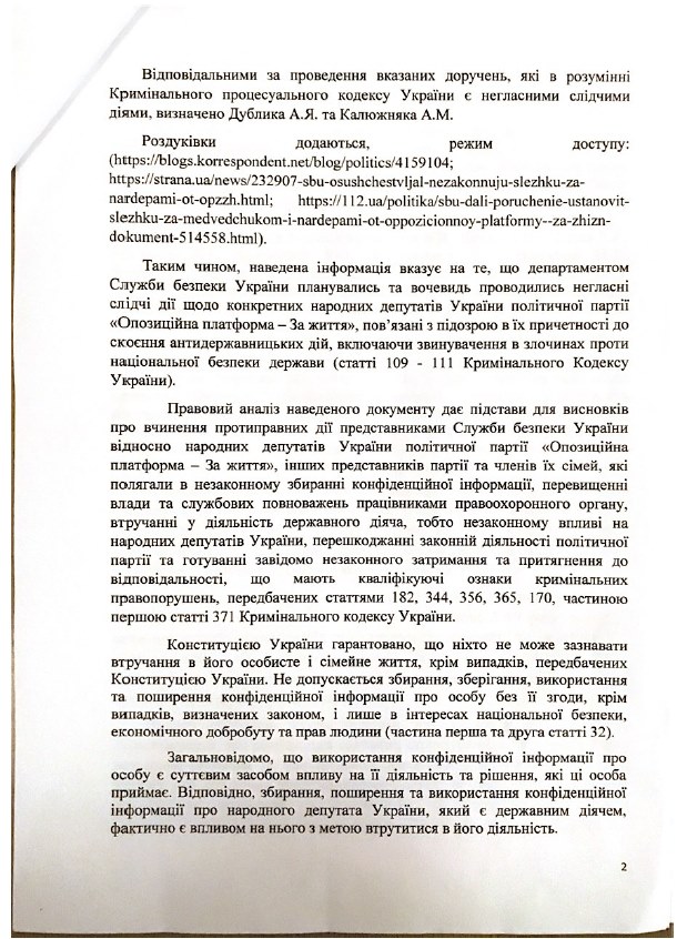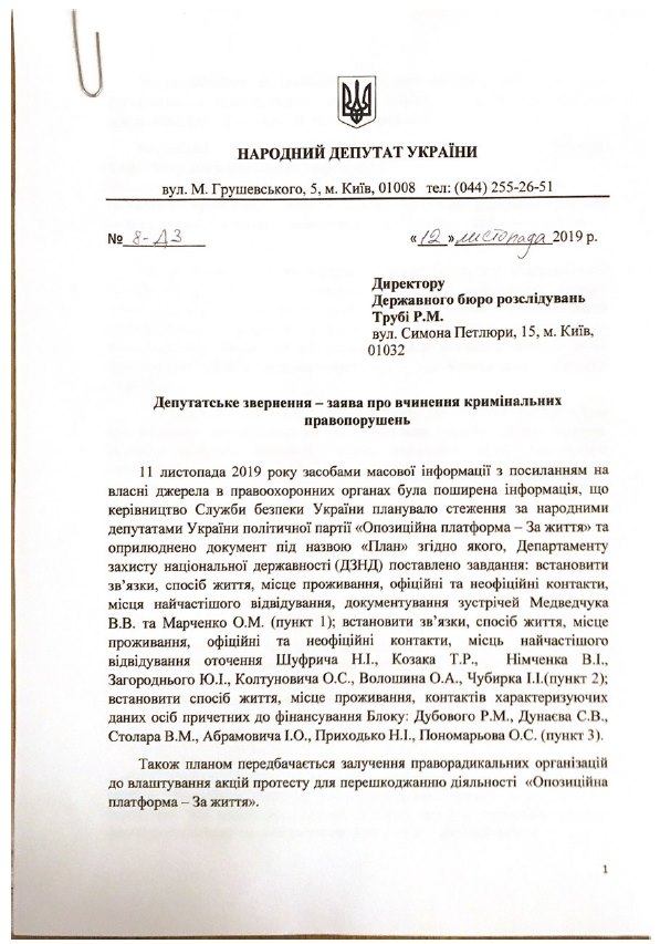 "Оппоплатформа - За жизнь" обратилась в ГБР по поводу незаконной слежки и прослушки СБУ