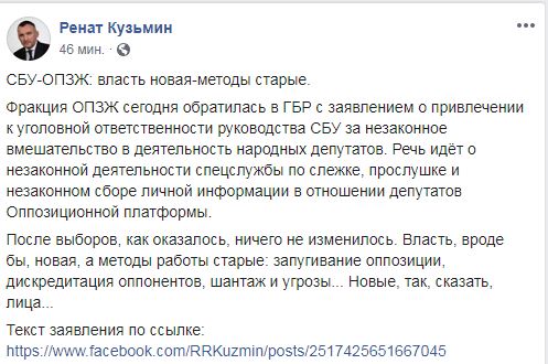 "СБУ-ОПЗЖ: власть новая - методы старые. Фракция ОПЗЖ сегодня обратилась в ГБР с заявлением о привлечении к уголовной ответственности руководства СБУ за незаконное вмешательство в деятельность народных депутатов. Речь идет о незаконной деятельности спецслужбы по слежке, прослушке и незаконном сборе личной информации в отношении депутатов "Оппозиционной платформы", - написал Кузьмин.
