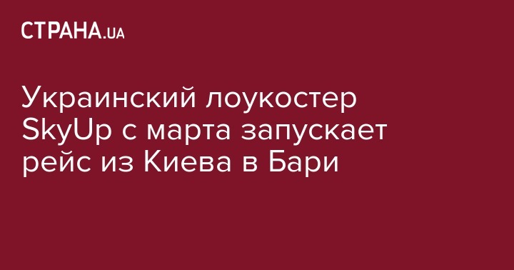 Украинский лоукостер SkyUp Airlines с 30 марта 2020 года запустит прямые рейсы из Киева в итальянский Бари. Как сообщила пресс-служба авиакомпании, рейсы будут осуществляться два раза в неделю – по понедельникам и пятницам. Стоимость билета в одну сторону без багажа составляет от 1694 грн.