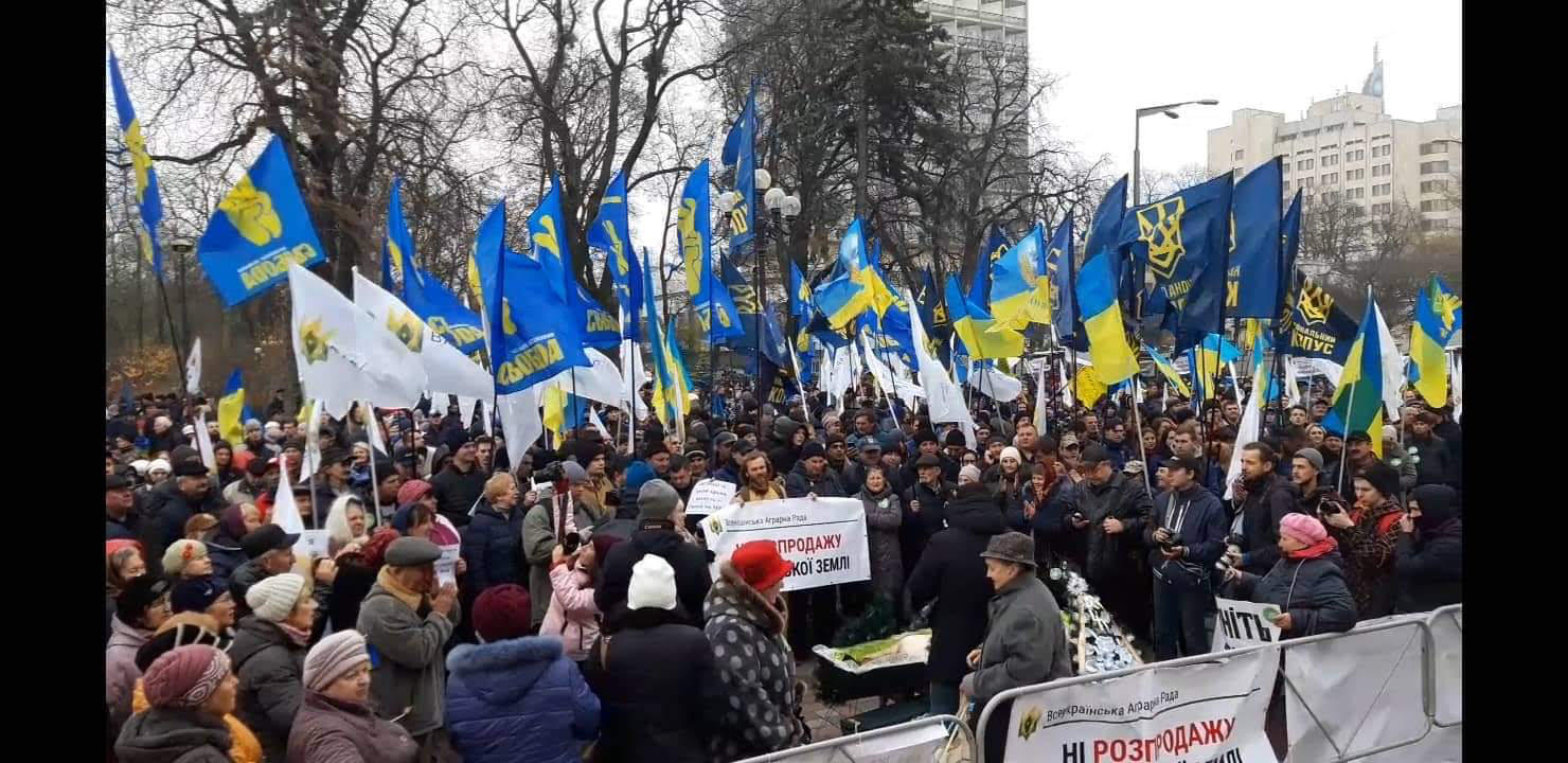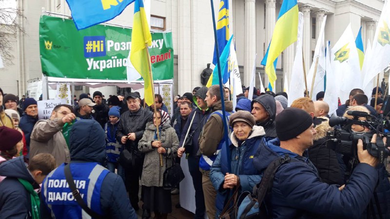Когда началось заседание ВР протестующие отошли от входов. Они сканируют " Нет продажи украинской земли".