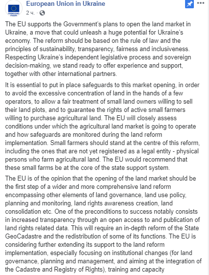 Также глава Представительства ЕС в Украине Матти Маазикас в своем микроблоге в Тwitter выразил надежду, что открытие рынка земли принесет пользу и мелким фермерам.