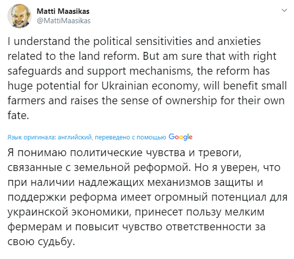 "Я понимаю политическую чувствительность и беспокойства, связанные с земельной реформой. Но я уверен, что с помощью правильных гарантий и механизмов поддержки реформа имеет огромный потенциал для украинской экономики, принесет пользу маленьким фермерам и повысит чувство собственности на их собственную судьбу", - написал в соцсети Матти Маазикас.
