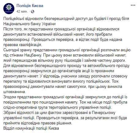 Полицейские восстановили беспрепятственный доступ в здание и проезд возле Национального банка Украины, убрав установленную активистами военную палатку. Об этом сообщается на странице полиции Киева в соцсети.