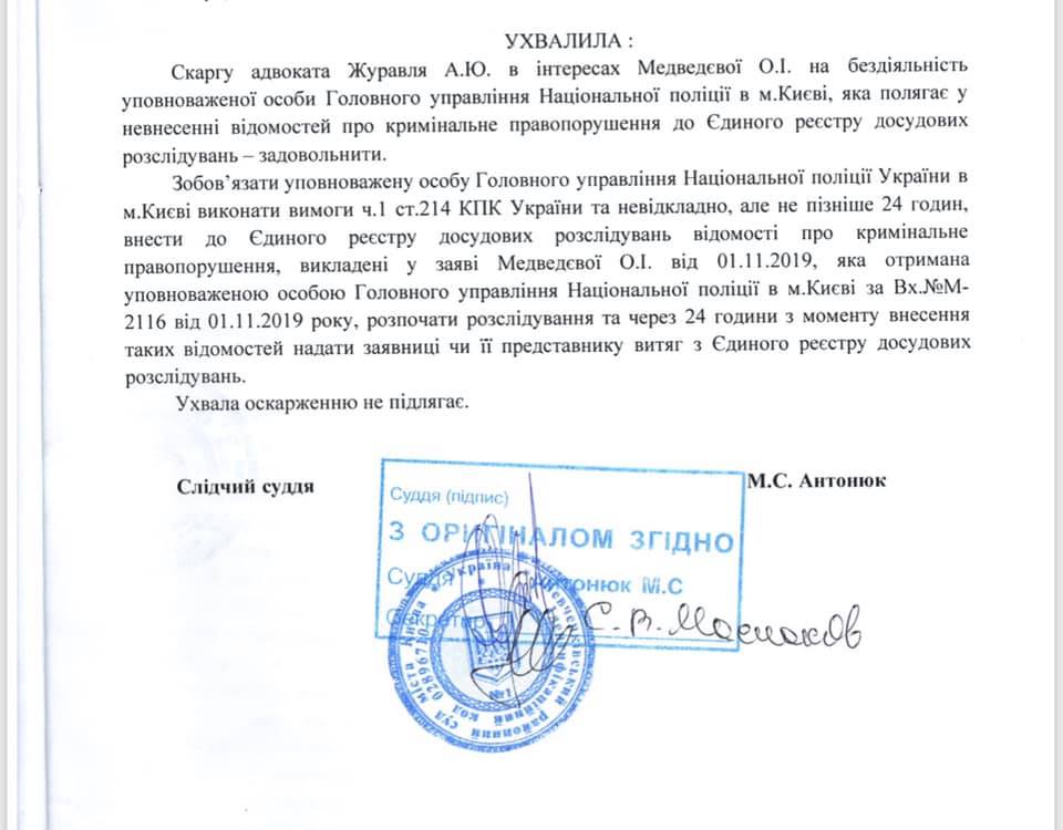"Плохие новости для разжигателей. В связи с медлительностью Национальной полиции в регистрации уголовного производства и проведении досудебного следствия относитительно разжигания ненависти г-ном Дроздовым О.П., нами была направлена жалоба в Шевченковский суд Киева. Своим решением от 12.11.2019 суд обязал Национальную полицию Киева начать расследование по моему заявлению от 01.11.2019. Ожидаем от Национальной полиции выполнения решения суда в ближайшее время и принятие необходимых следственных и процессуальных решений", - написала Медведева.
