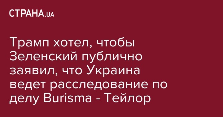 Временный поверенный в делах США в Украине Уильям Тейлор сказал, что президенту США Дональду Трампу было мало личного обещания президента Украины Владимира Зеленского провести расследования дела по "Burisma Holdings", в которой работал сын бывшего вице-президента США Джо Байдена - Хантер Байден. Об этом он сказал в ходе публичных слушаний по импичменту в отношении президента Дональда Трампа в среду в Палате представителей Конгресса США.