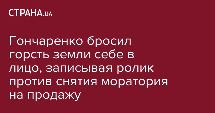 "Зеленский! Ты шулер! Ты обещал людям все спрашивать на референдуме и все решения принимать вместе с людьми. А сегодня ты говоришь: я спрошу у вас, можно ли продавать землю иностранцам. А продавать землю по 200 тысяч гектаров в одни руки, пусть даже и местным олигархам, ты не хочешь спросить, согласны ли на это люди? Люди за это бросят горсть земли на гроб с твоим политическим трупом", - сказал Гончаренко и швырнул землю в камеру, после чего она отлетела и попала ему в лицо.