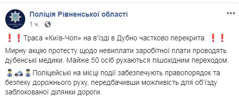 "Мирную акцию протеста относительно невыплаты заработной платы проводят Дубенские медики. Почти 50 человек двигаются по пешеходному переходу, периодически освобождая проезжую часть для движения транспортных средств", - сказано в сообщении.