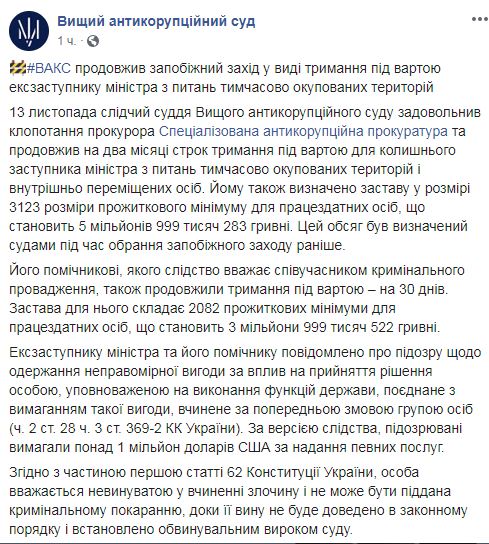 "13 ноября следственный судья Высшего антикоррупционного суда удовлетворил ходатайство прокурора Специализированной антикоррупционной прокуратуры и продлил на два месяца срок содержания под стражей для бывшего заместителя министра по вопросам временно оккупированных территорий и внутренне перемещенных лиц", - говорится в сообщении.