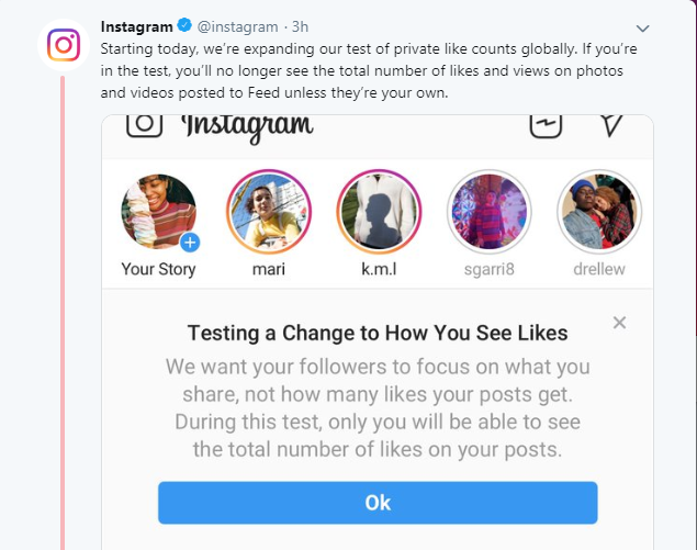 18 июля Instagram в тестовом режиме перестал показывать, сколько лайков поставили пользователи под публикацией. Тогда обновление затронуло Австралию, Бразилию, Италию, Ирландию, Новую Зеландию и Японию.