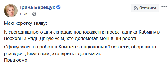С сегодняшнего дня оставляю полномочия представителя Кабмина в Верховной Раде. Спасибо всем, кто помогал мне в этой работе.