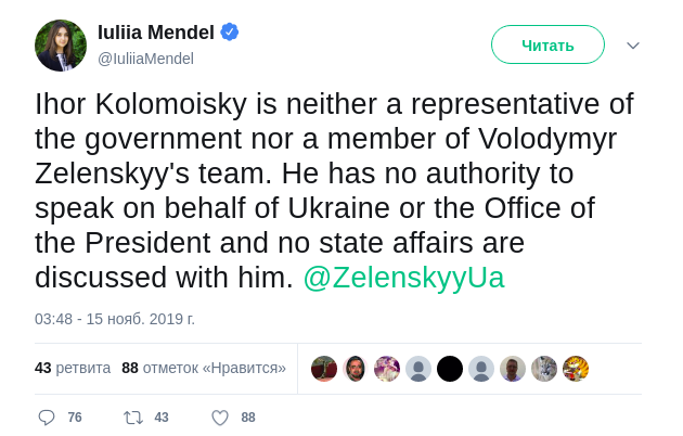 Украинский бизнесмен Игорь Коломойский не является представителем власти и команды президента Украины Владимира Зеленского. Также он не уполномочен говорить от имени государства. Об этом заявила пресс-секретарь президента Украины Владимира Зеленского Юлия Мендель в Twitter в пятницу, 15 ноября.
