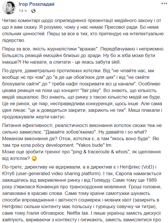 Получив закономерно негативные отзывы на свое законотворчество, Розкладай написал гневный пост в Facebook. Он заявил, что нужно укранизировать Netflix и пожалел, что создать единую журналистскую организацию будет очень сложно - судя по реакции журналистов.
