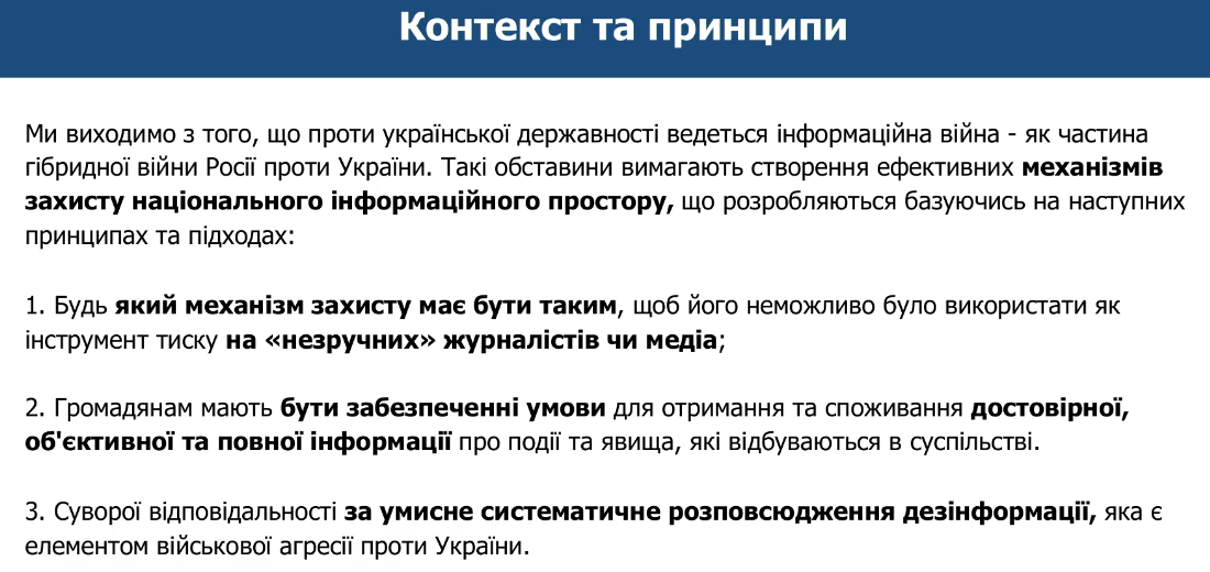 На экране возник слайд из презентации, на котором описаны главные принципы будущего законопроекта. Оговаривая, что давить на "неудобных" журналистов нельзя, в министерстве указали, что нужно вводить "суровую ответственность за умышленное систематическое распространение дезинформации, которая является элементом военной агрессии против Украины".