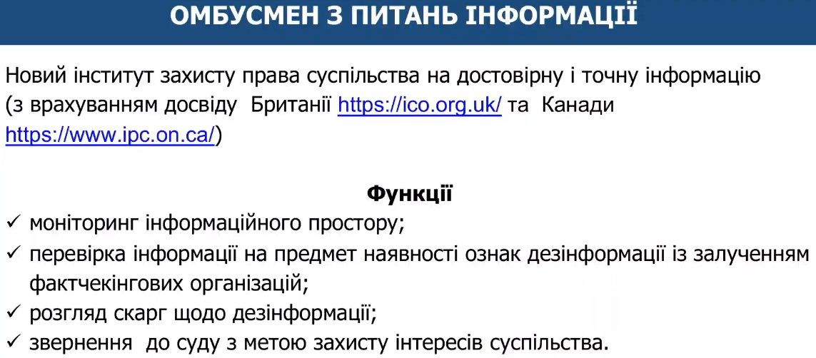 Эту роль обмудсмена – подавать в суд - первой назвал Максимчук, хотя на слайде она деликатно поставлена в самом низу. "Его задача – обращение в суд, чтобы ее (дезинформацию – Ред.) запретить", - сказал зам Бородянского.