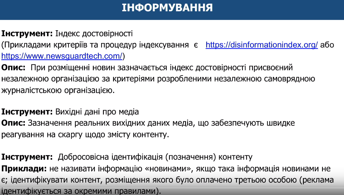 Эта же организация будет проверять новости на достоверность и присваивать им специальный индекс. Как пример приводят британский Global Disinformation Index (GDI) – некоммерческую британскую организацию, чьи отчеты никаких юридических или политических последствий не имеют. Однако в Украине, похоже, этот индекс будет практически государственным.