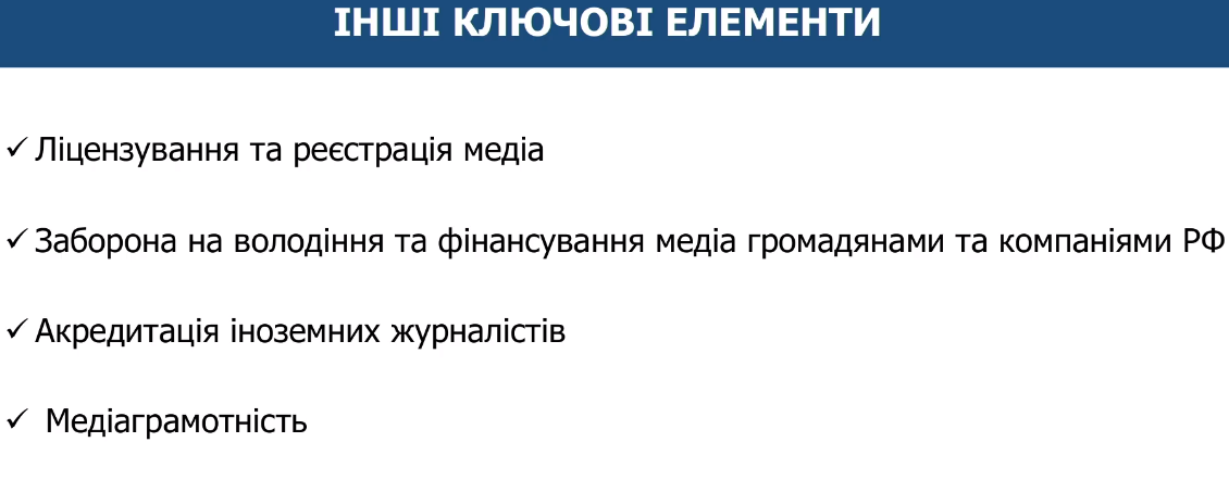 В их перечне обращает на себя внимание наличие должности омбудсмена по вопросам информации, регистрация СМИ ("у нас часть медиа за пределами правового регулирования, и это позволяет устраивать массированные атаки против украинской государственности"), запрет россиянам владеть медиа в Украине. А также "ответственность", указанная последним пунктом.