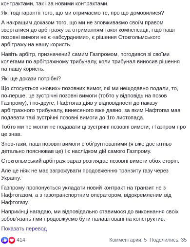 "Что касается „новых" исковых требований, которые мы недавно подали, то, во-первых, это встречные исковые требования (в ответ на иск „Газпрома"), и, во-вторых, „Нафтогаз" действовал в соответствии с приказом арбитражного трибунала, вынесенного уже давно, по которому „Нафтогаз" должен подавать такие встречные исковые требования до 1-го ноября", - ответил Витренко.