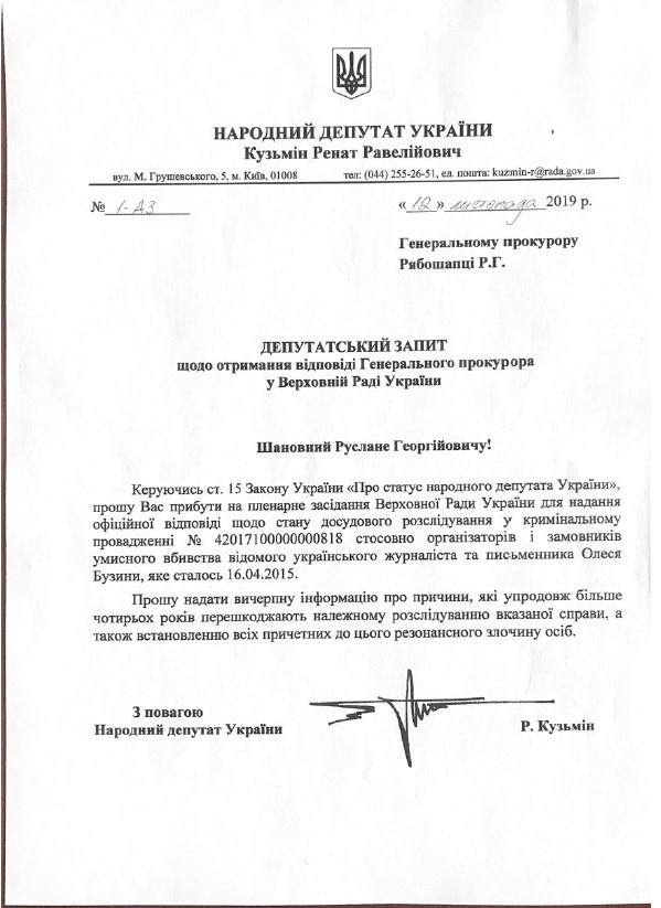 Генеральный прокурор Украины Руслан Рябошапка должен отчитаться по делу об убийстве журналиста и писателя Олеся Бузины в Верховной Раде. Такое мнение выразил народный депутат от фракции "Оппозиционная платформа - За жизнь" Ренат Кузьмин в Facebook.