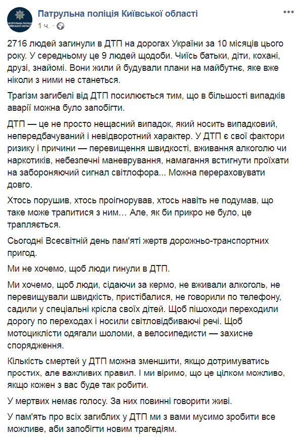 По случаю Всемирного дня памяти жертв дорожно-транспортных происшествий, который приходится на 17 ноября, патрульная полиция Киевской области обнародовала статистику смертей на украинских дорогах. Данные приведены в Facebook полиции.